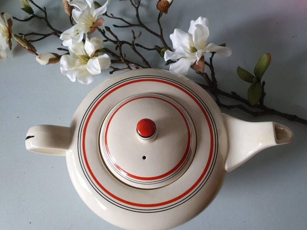 Société Céramique Maestricht - Model Twente, Decor oranje/rood (1), zwarte (2) bies. Oranje knop.