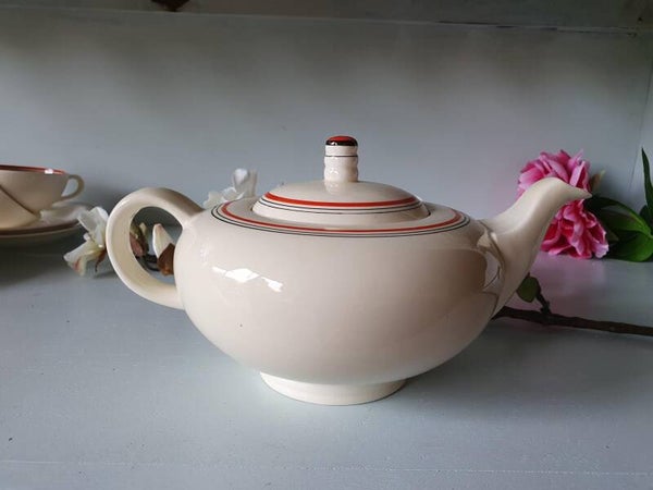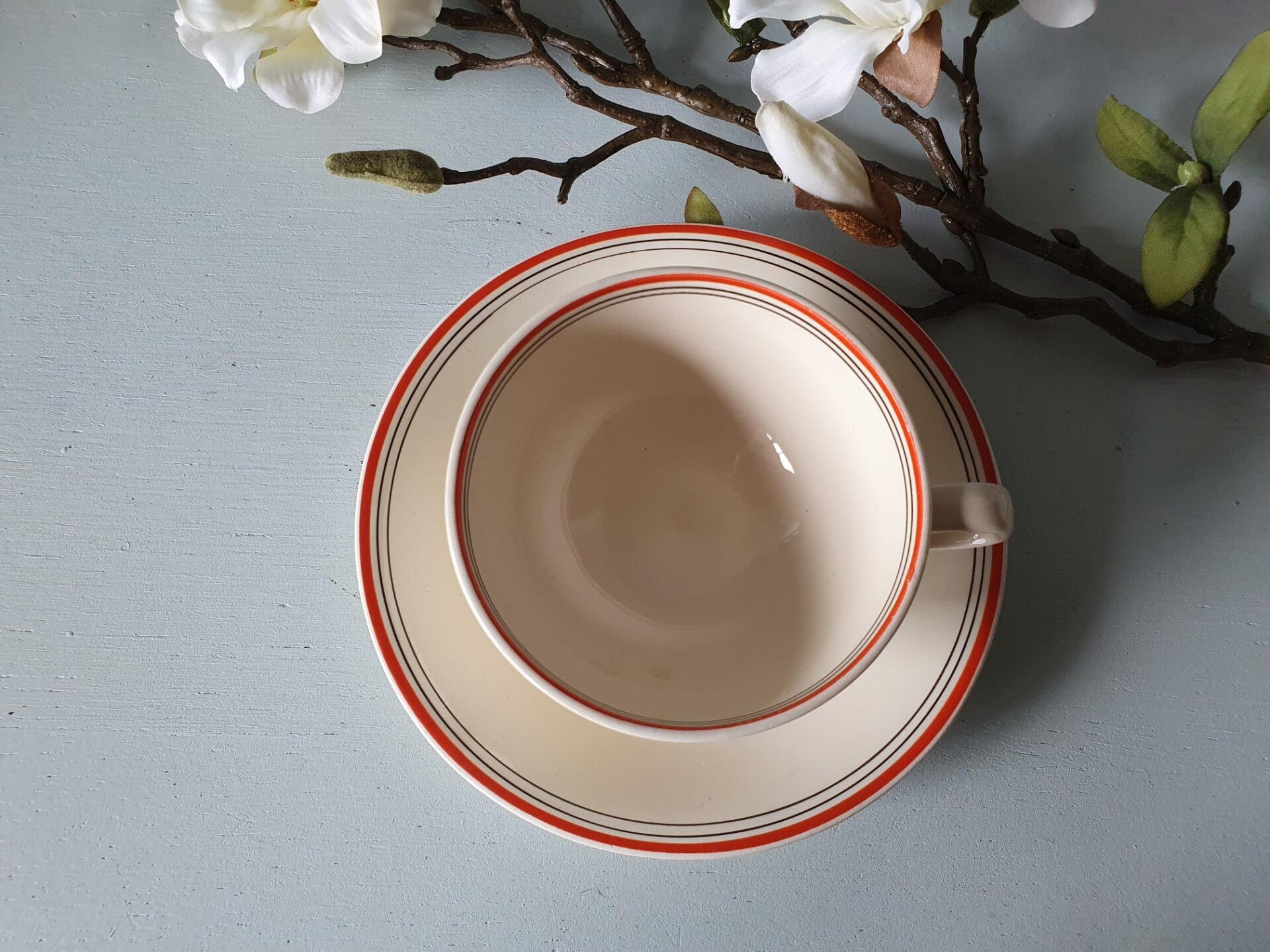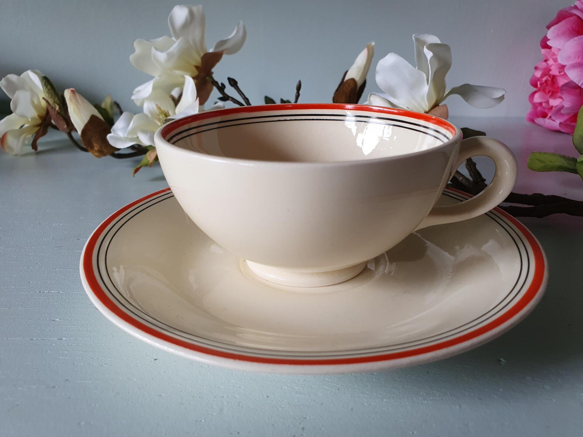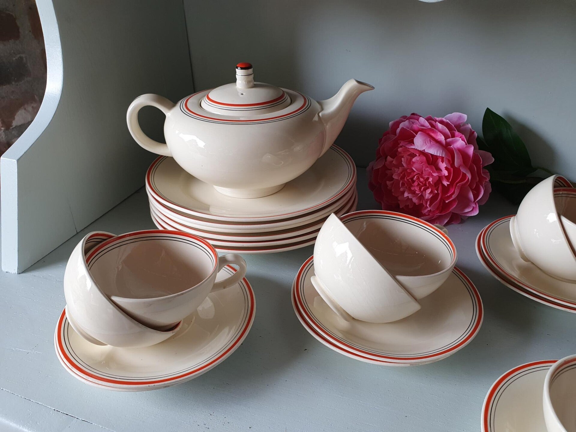 Ontbijt/Theeservies 6 persoons Model Twente Société Céramique Maastricht, Decor oranje/rood/ zwarte bies.