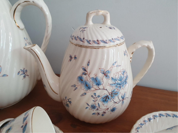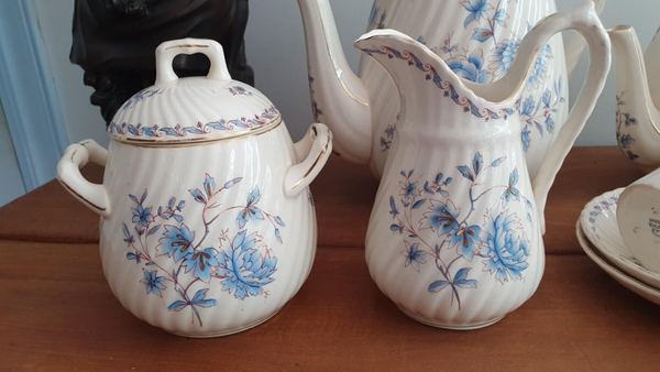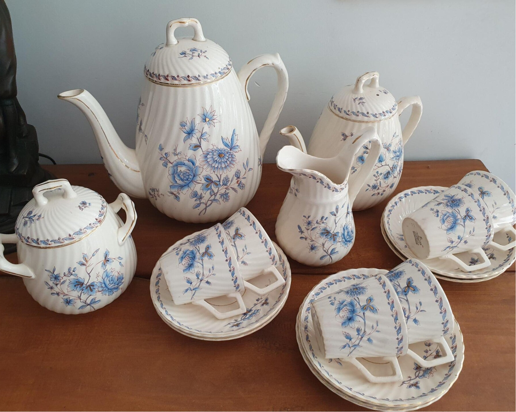 Antiek koffie/ theeservies, getorst decor 33; mooie lichtblauwe en goudgekleurde accenten