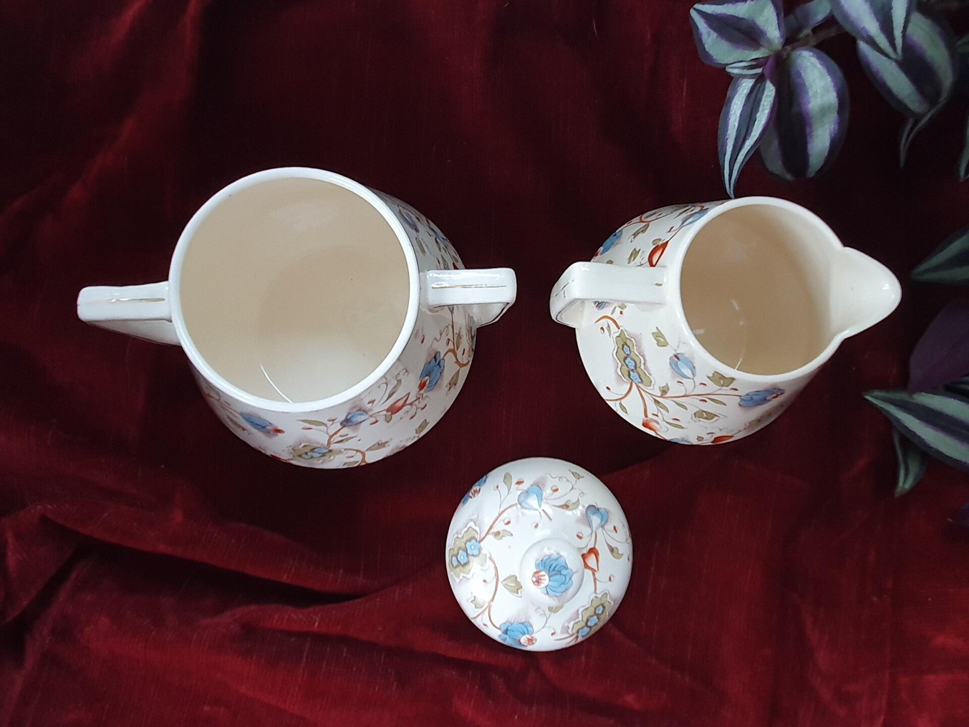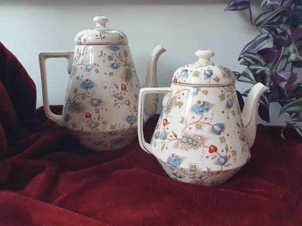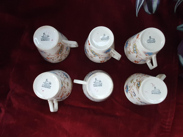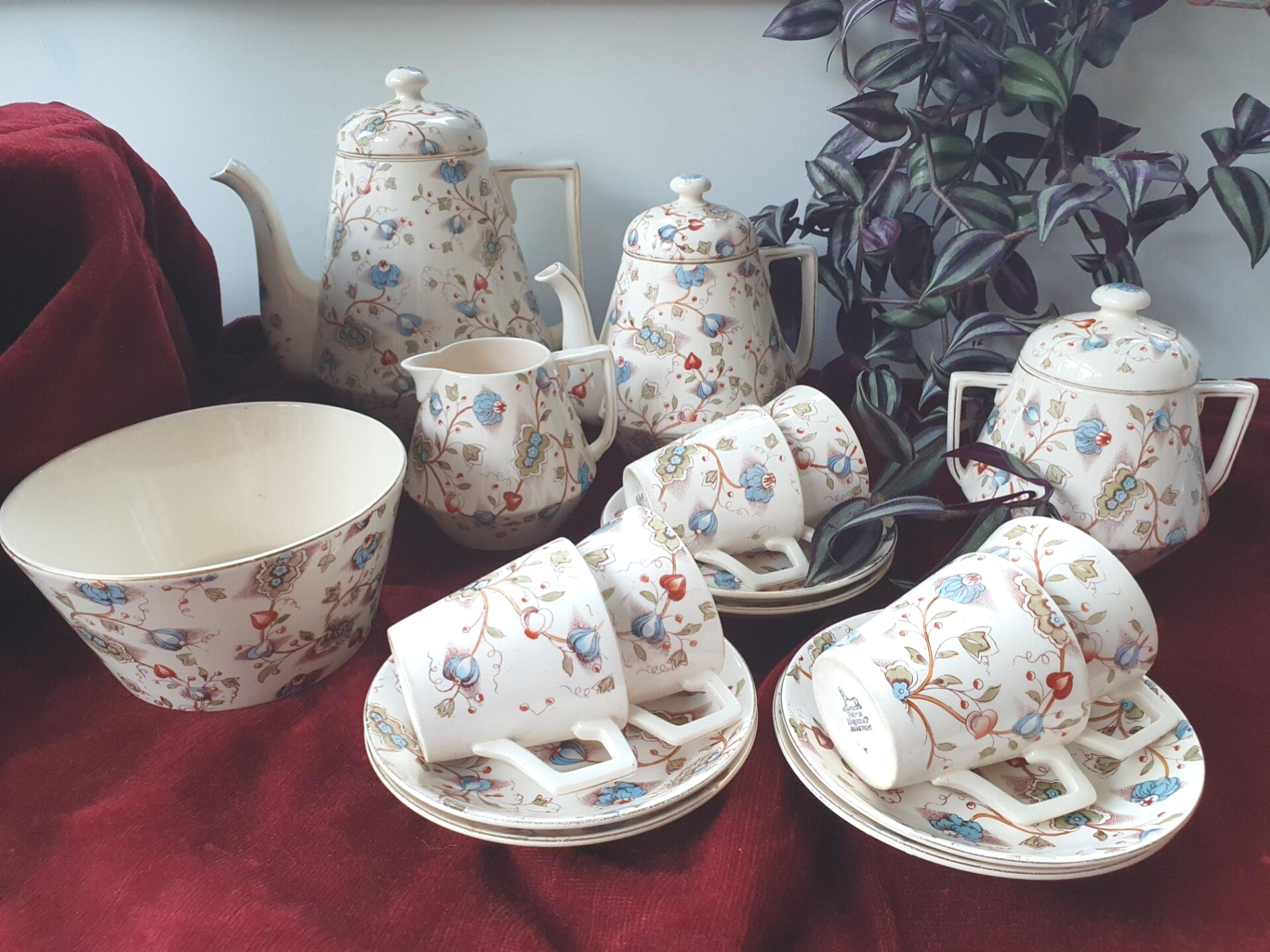 Antiek koffie/ theeservies, Model Fransch/ Pisa glad, decor 200 (1887-1897) 6 persoons; Het is gedecoreerd met een chintz bloemenpatroon tegen een ivoorkleurige achtergrond.