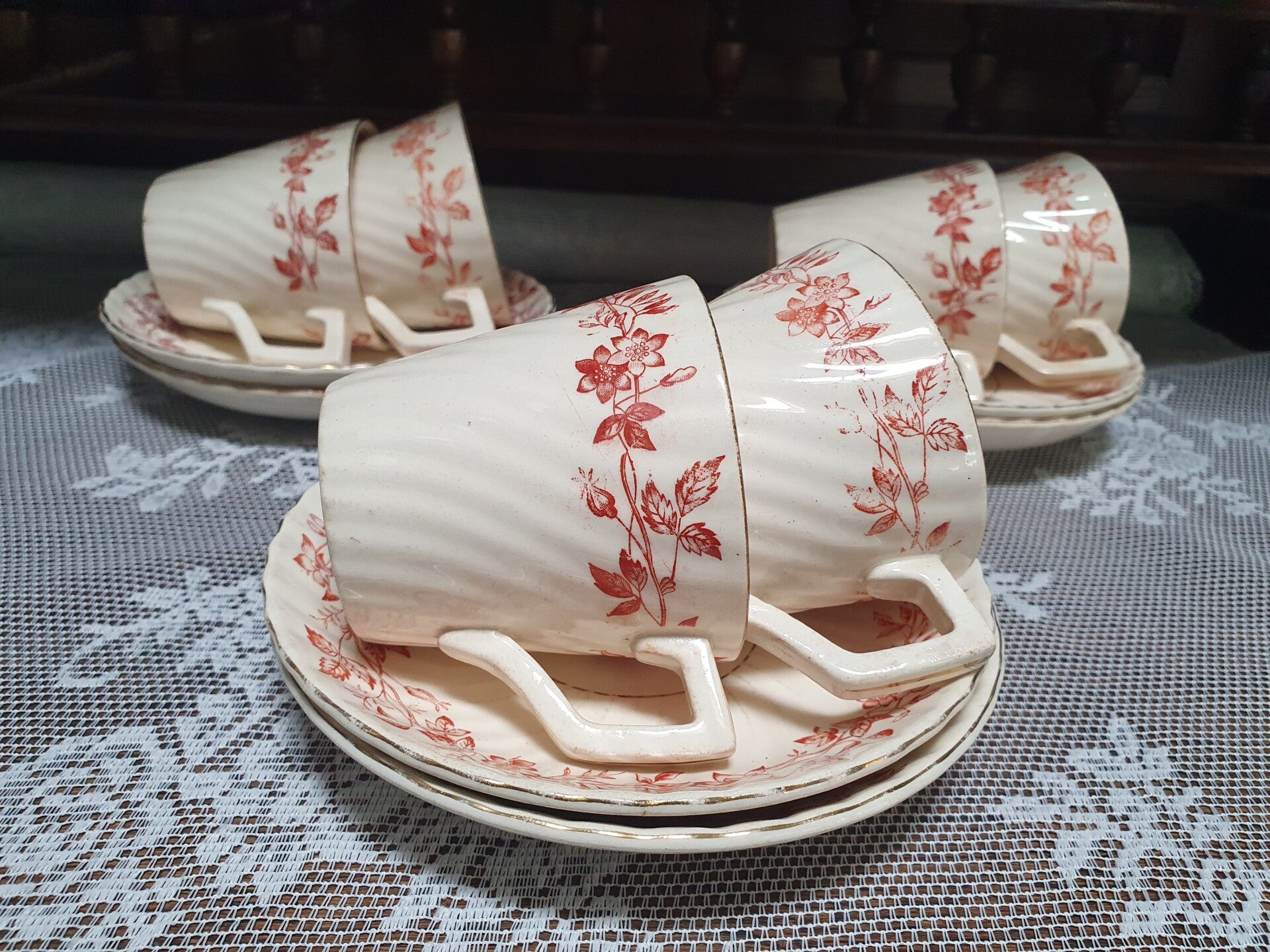 Antiek koffie/ theeservies, getorst decor 198; zeldzaam decor met mooie rode bloemrank.