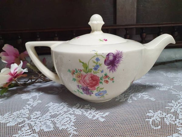 Theepot Petrus Regout - Model Perle, decor paarse Iris/ Tulp/ Lis