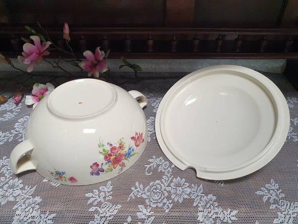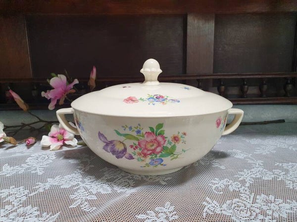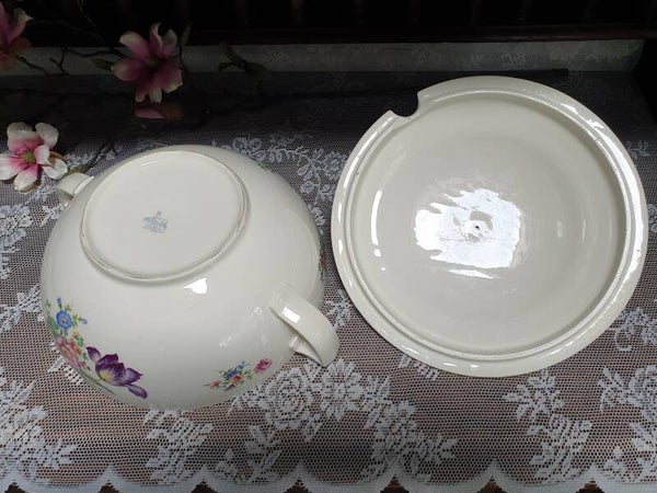 Soepterrine Petrus Regout - Model Perle, decor paarse Iris/ Tulp/ Lis