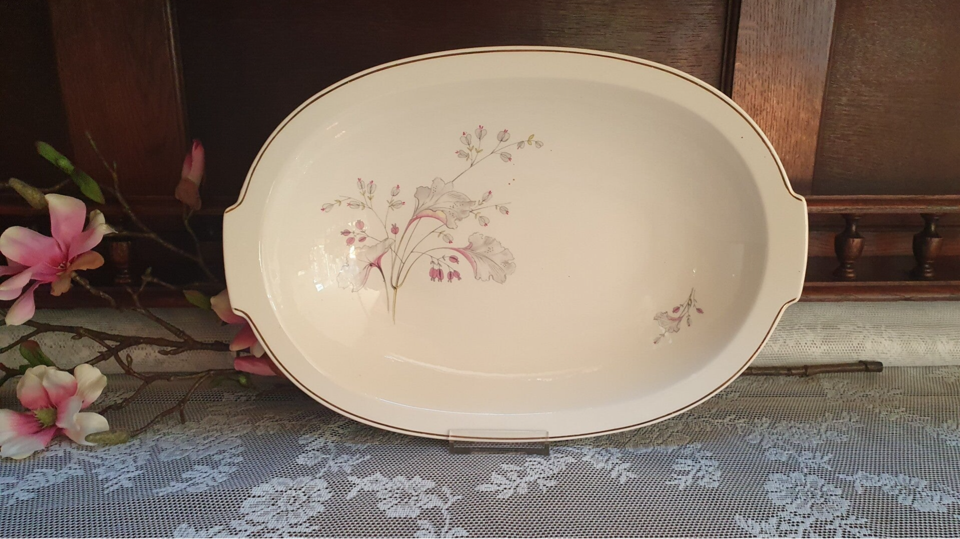 Broodschaal/ schaal - Petrus Regout - Decor Grijze bladeren met rose accenten