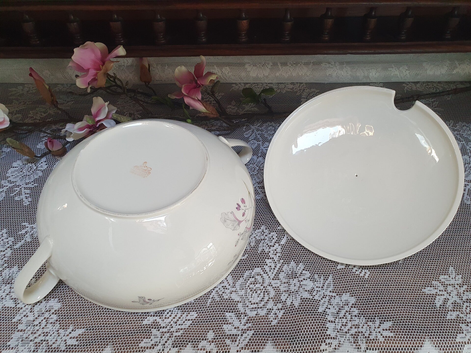 Soepterrine - Petrus Regout - Decor Grijze bladeren met rose accenten