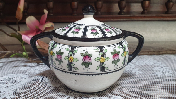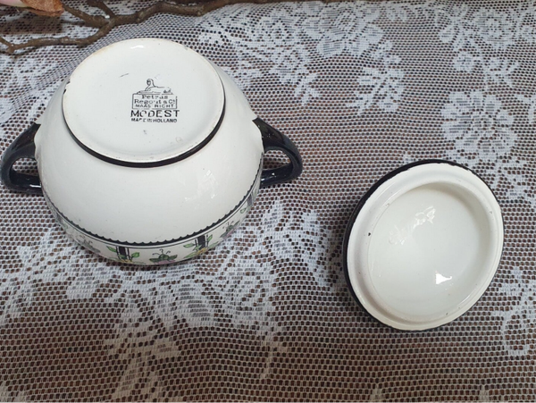Suikerpot - Petrus Regout - Decor Modest, zwart en inkleur.