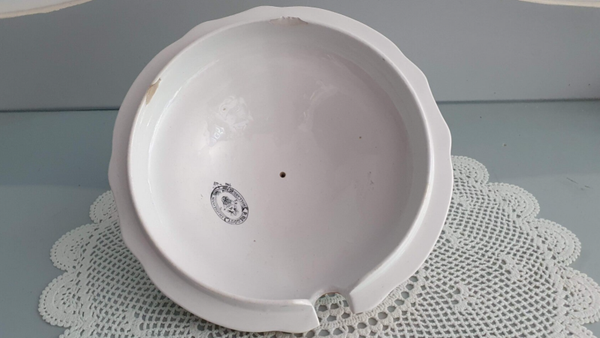 Soepterrine Petrus Regout - Model Grenade, Decor perzikkleurige rand, gedecoreerd met oranje bies en bladeren.